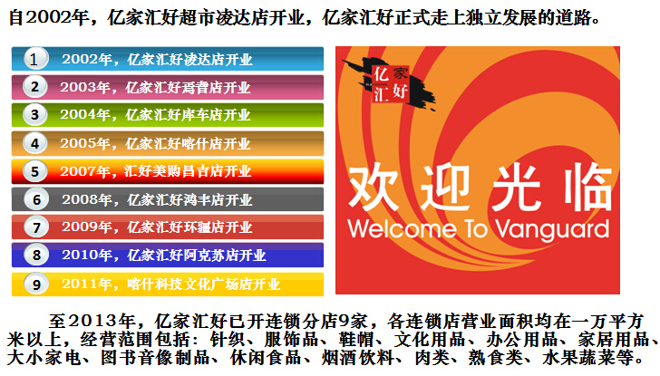 億家匯好商貿(mào)有限責(zé)任公司于2002年成立,并從臺灣引進(jìn)連鎖經(jīng)營職業(yè)管理團(tuán)隊(duì),統(tǒng)一管理旗下各地的連鎖超市。公司通過多年的穩(wěn)健發(fā)展,至2013年底,億家匯好商貿(mào)有限責(zé)任公司已成為擁有員工近3000多人,下轄一個(gè)配送中心和9家連鎖超市的大型綜合性零售企業(yè)??偨?jīng)營面積11萬多平方米,配送中心輻射公司所有超市,年配送額可達(dá)2億元。公司大量吸納下崗職工,經(jīng)過崗前培訓(xùn),提高勞動技能,實(shí)現(xiàn)了他們的再就業(yè),為維護(hù)社會和諧穩(wěn)定做出了貢獻(xiàn)。2013年,巴州億家匯好商貿(mào)有限責(zé)任公司在自治區(qū)零售業(yè)中穩(wěn)踞前三位,是自治區(qū)重要的流通龍頭企業(yè),2013年年銷售收入達(dá)10億人民幣。多年來,公司一直重管理、抓實(shí)效、運(yùn)用先進(jìn)的管理手段和營銷理念,秉承億家匯好人 時(shí)時(shí)尋求效率創(chuàng)新,事事講究專業(yè)技術(shù)的文化精髓,創(chuàng)造了良好的經(jīng)濟(jì)效益和社會效益。公司先后多次被消費(fèi)者協(xié)會評為誠信單位,并多年被評為重合同,守信用單位。